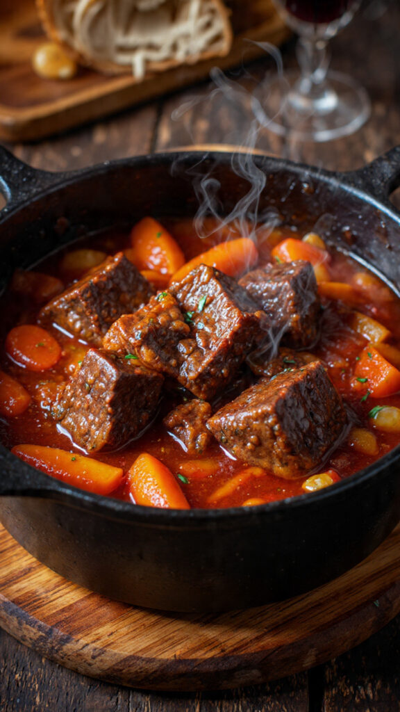 La queue de bœuf aux carottes est un plat du terroir français d’une tendresse incomparable. Longuement mijotée, la viande se détache toute seule de l’os et s’imprègne d’une sauce riche, parfumée au vin rouge, aux herbes et aux légumes. Ce ragoût traditionnel séduit par son authenticité et son goût profond — un véritable plat de famille à partager lors des dimanches d’hiver ou des repas conviviaux.