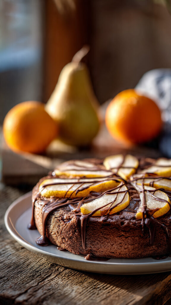 Grâce à l’huile végétale et au lait végétal, la texture reste souple et aérienne, tandis que les poires apportent une touche fondante et fraîche qui se marie à merveille avec l’intensité du chocolat noir.