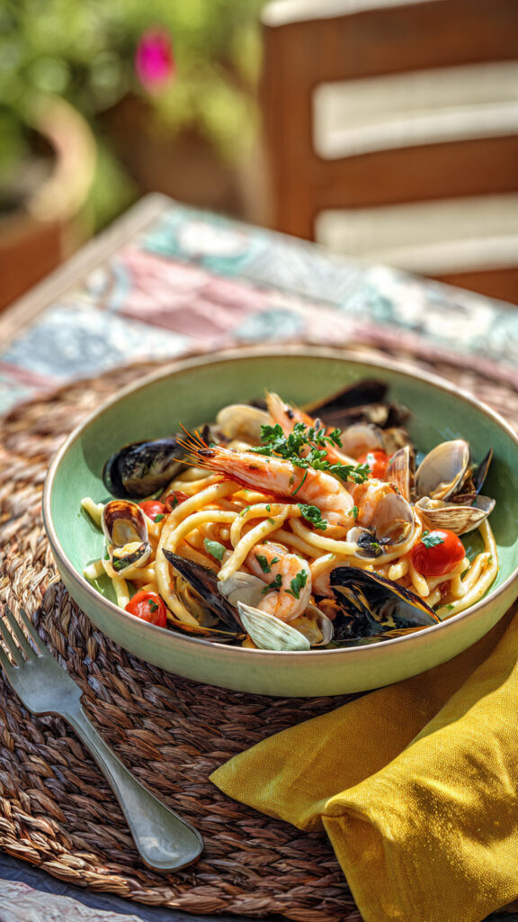 Les strozzapreti aux fruits de mer sont un plat typiquement italien, né sur les côtes de l’Adriatique, où les pêcheurs aiment marier leurs prises fraîches à des pâtes rustiques et savoureuses. Ces pâtes allongées, torsadées à la main, s’imprègnent parfaitement de la sauce aux fruits de mer, créant un mariage entre la terre et la mer d’une incroyable gourmandise.