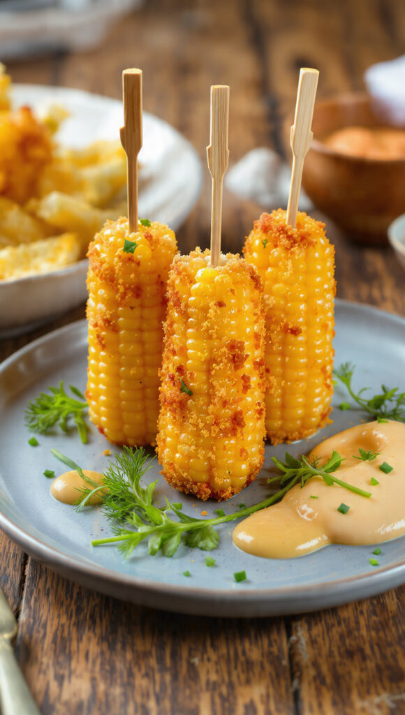Ces épis de maïs frits sont une idée originale et ultra gourmande pour un apéritif ou un snack qui surprend. Enrobés d’une chapelure croustillante et dorée, servis sur un lit de sauce crémeuse légèrement épicée, ils deviennent un petit plaisir à manger du bout des doigts.