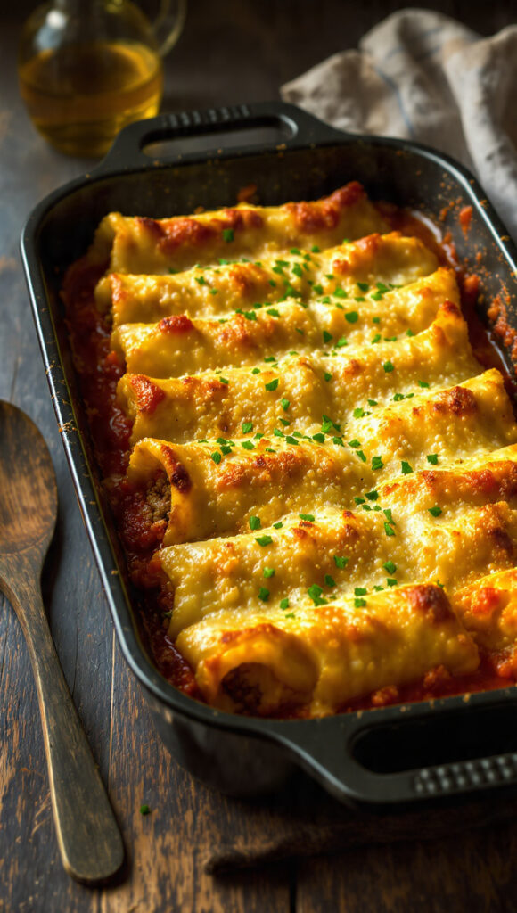 Voici le plat réconfortant par excellence : des cannelloni généreusement farcis au bœuf, nappés d’une sauce tomate parfumée et gratinés d’une belle couche de fromage doré.