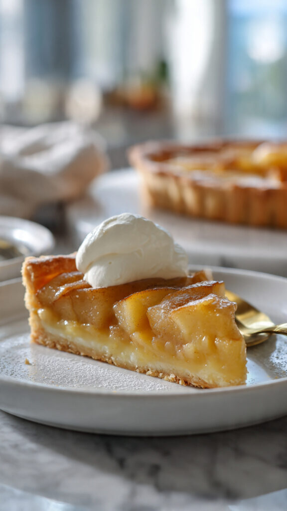 Dès la sortie du four, la tarte aux pommes normande embaume toute la cuisine avec ses parfums de pommes fondantes et de crème vanillée. Plus riche qu’une tarte classique, elle se distingue par son appareil crémeux à base de crème fraîche qui sublime les fruits et lui donne une texture irrésistiblement fondante.