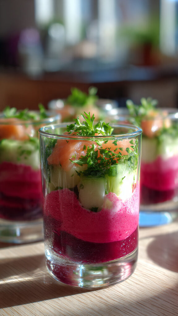 Colorées, légères et pleines de fraîcheur, ces verrines de betterave et concombre sont parfaites pour ouvrir un repas avec élégance. En plus d’être rapides à préparer, elles font toujours sensation sur la table grâce à leurs jolies couches rose et blanche.