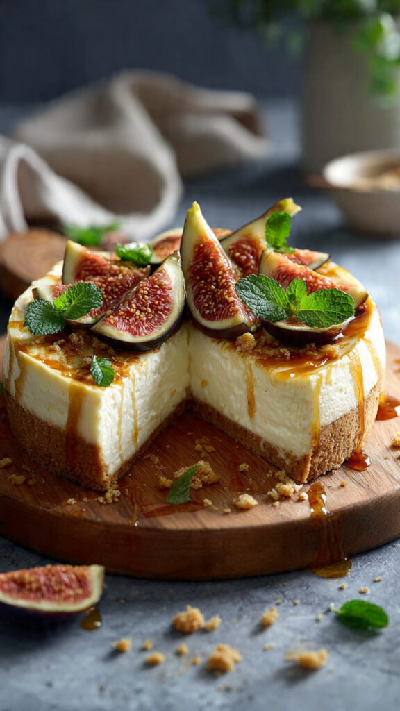 Ce gâteau au fromage au yaourt, figues et miel est un vrai rayon de soleil dans l’assiette. Plus léger qu’un cheesecake classique, il marie la douceur du yaourt, l’onctuosité du fromage frais et la gourmandise des figues fraîches nappées de miel. Chaque part évoque les desserts méditerranéens, simples, naturels et terriblement savoureux.