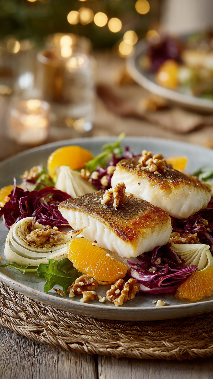 🐟🍊 Turbot à la poêle avec salade d’oranges, radicchio et noix