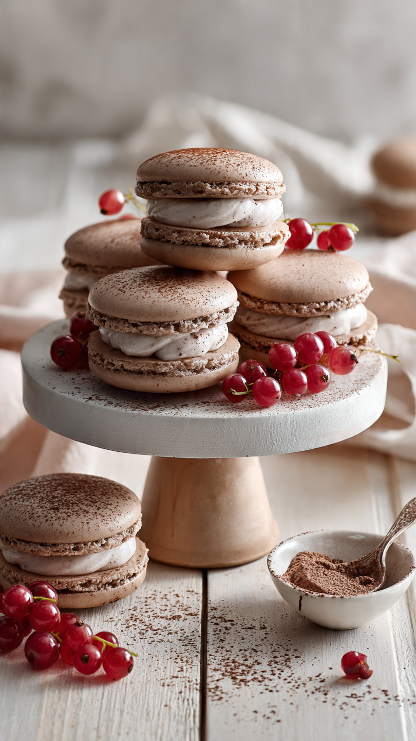 Délicats, élégants et intensément gourmands, ces macarons au cacao garnis d’une crème au mascarpone et groseilles sont un vrai bijou de pâtisserie. Le contraste entre la coque chocolatée légèrement croquante, la crème douce et onctueuse, et l’acidité fraîche des groseilles crée un équilibre parfait en bouche. C’est une recette idéale pour impressionner lors d’un goûter…